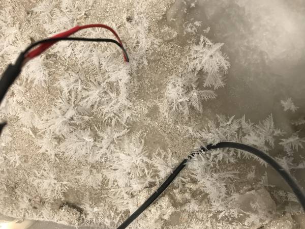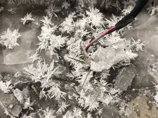 Operating at different scales, other spatial and musical mappings are at play in Twenty Springs. The data stream of each sensor is modulating the wavetable positions and filters of a synthesized tone. The local CO2 sensor's data stream is the only one that modulates not a synthesized sound but recordings of freezing and melting processes taken in the geophysical lab of the permafrost research group. When all these voices are joined together, the installation sounds as a fluctuating chord whose tones are also mapped to the relative position of the sensors within the station: High pitched sounds are mapped to the changing conditions of the air, lower ones play the layered ground(s) and the bass sonifies the underground. In addition, this drone’s tuning is heard as a very slow rise: Climbing 192 cents during the sixty minutes loop, it is the sounding analogy to the measured 1.92°C mean temperature rise at the Bayelva site in the last 20 years.