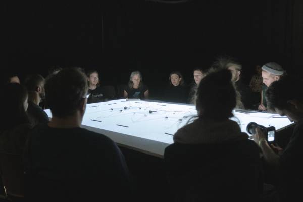 Instrumentalities for Common Grounds is a participatory performance that collectively tunes into sonifications of environmental data, scaling 20 years of hourly arctic measurements into 60 minutes. In this immersive performance-lecture the Sono-Choreographic Collective shares methods developed for listening, sensing, understanding and connecting to climate change from an embodied perspective. During the performance, participants are guided through various sonic and somatic techniques that tie the planetary scales with individual and collective sensory scales. The performance unfolds around a table that is a hybrid surface for discourse, policy, strategy, negotiation, communication and communion.